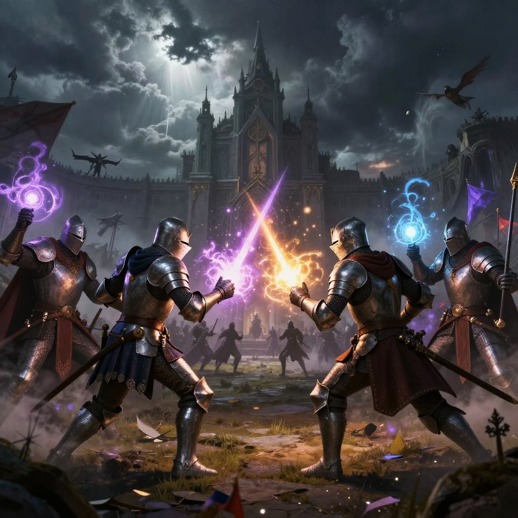 AI art DnD battlefield with knights and wizards clashing under a stormy sky, vivid magic effects illuminating the scene, high-detail medieval armor and spellcasting gestures, epic fantasy style, dramatic composition and intense colors.