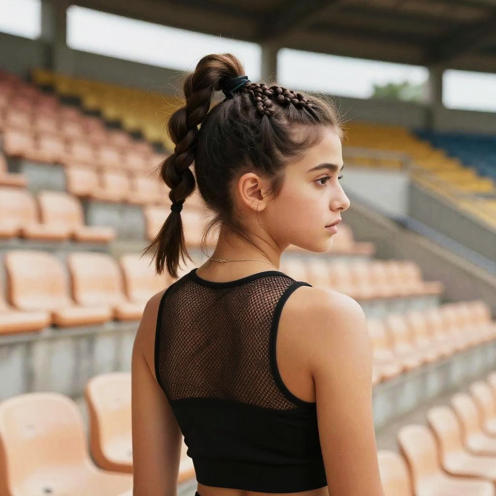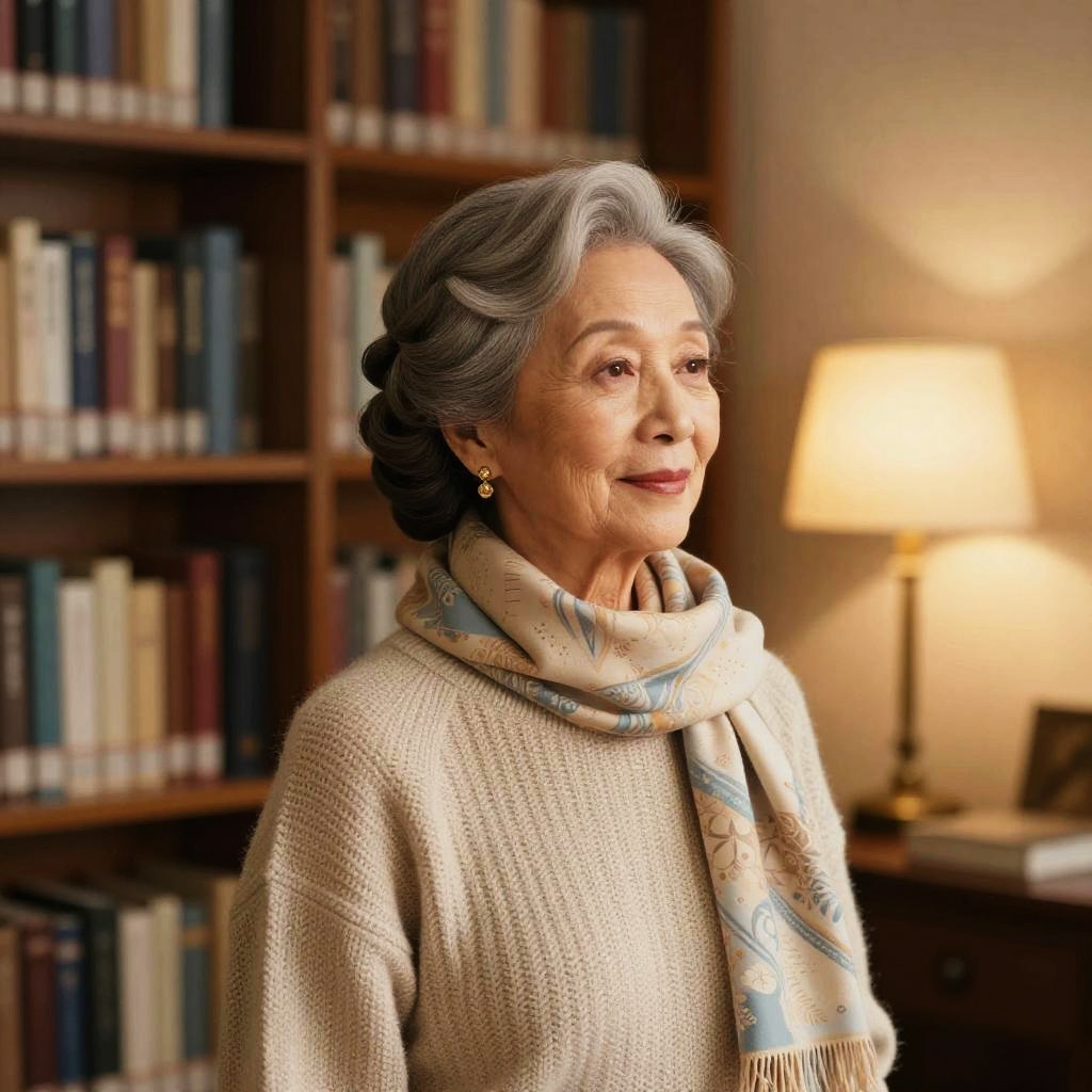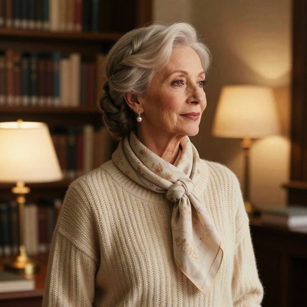 Mini Twists hairstyle on older woman, wearing elegant knit sweater with scarf, in library corner, captured in fashion editorial style with warm soft lamps.