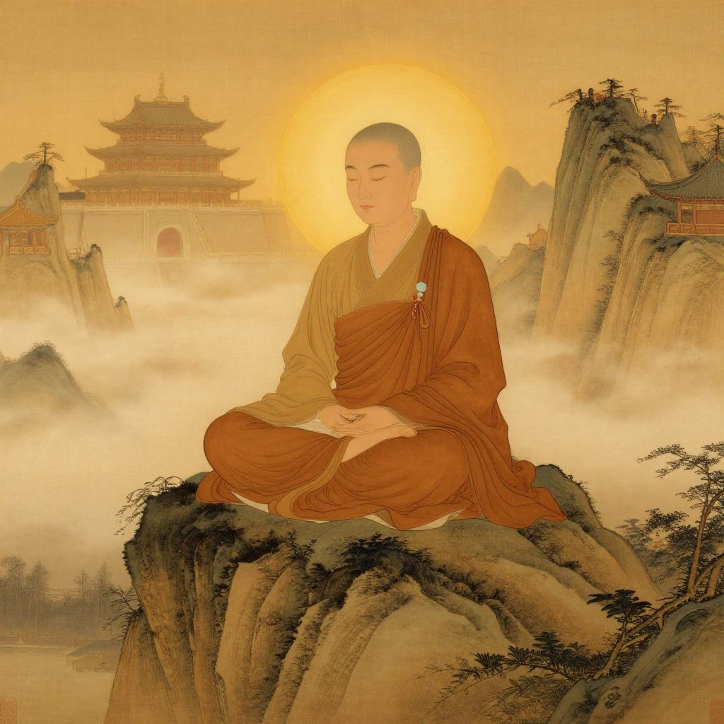 Human monk art depicting a serene monk meditating atop a misty mountain at dawn, surrounded by ancient temples and flowing robes, with warm golden light and intricate details in a traditional East Asian painting style.