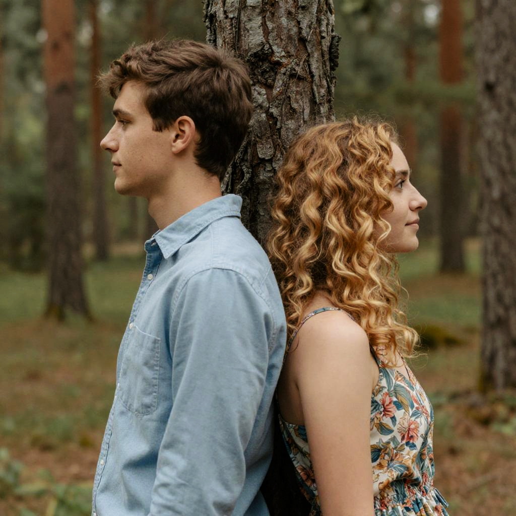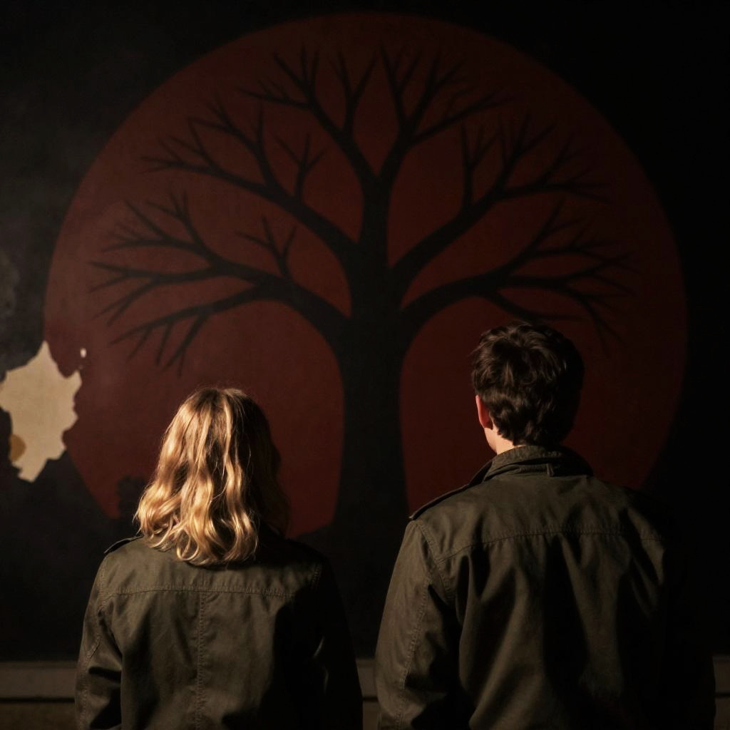 Photograph of two people from behind, viewing a dark, torn mural of a leafless tree with red background. One has blonde hair, the other brown hair. Both wear green jackets. Mural is peeling and dimly lit.