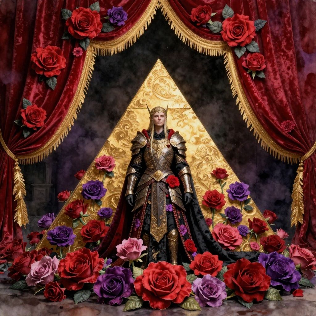 Imbue the image with visions of hope, wonderment, and majestic majesty., floral fabric made elven warrior, golden pyramid, saverot, red, (purple:1.25), black, gold, velvet with a large, sharp edges, gold red curtains, decorated in the shape of a rose, rose flowers all around, curved artistic adorned with delicate patterns patterns, painted by Michelangelo, flowers, D&D, watercolor painting, Trending on artstation, artstationHD, octane render, cinematic, hyper realism, 8k, depth of field, 3D, aperture f2.2, darkness 16k, vibrant colors, RAW, highly detailed epic, HD Art by John Cassadomor longsden long shot on artstation, concept art by Tyler Edlin