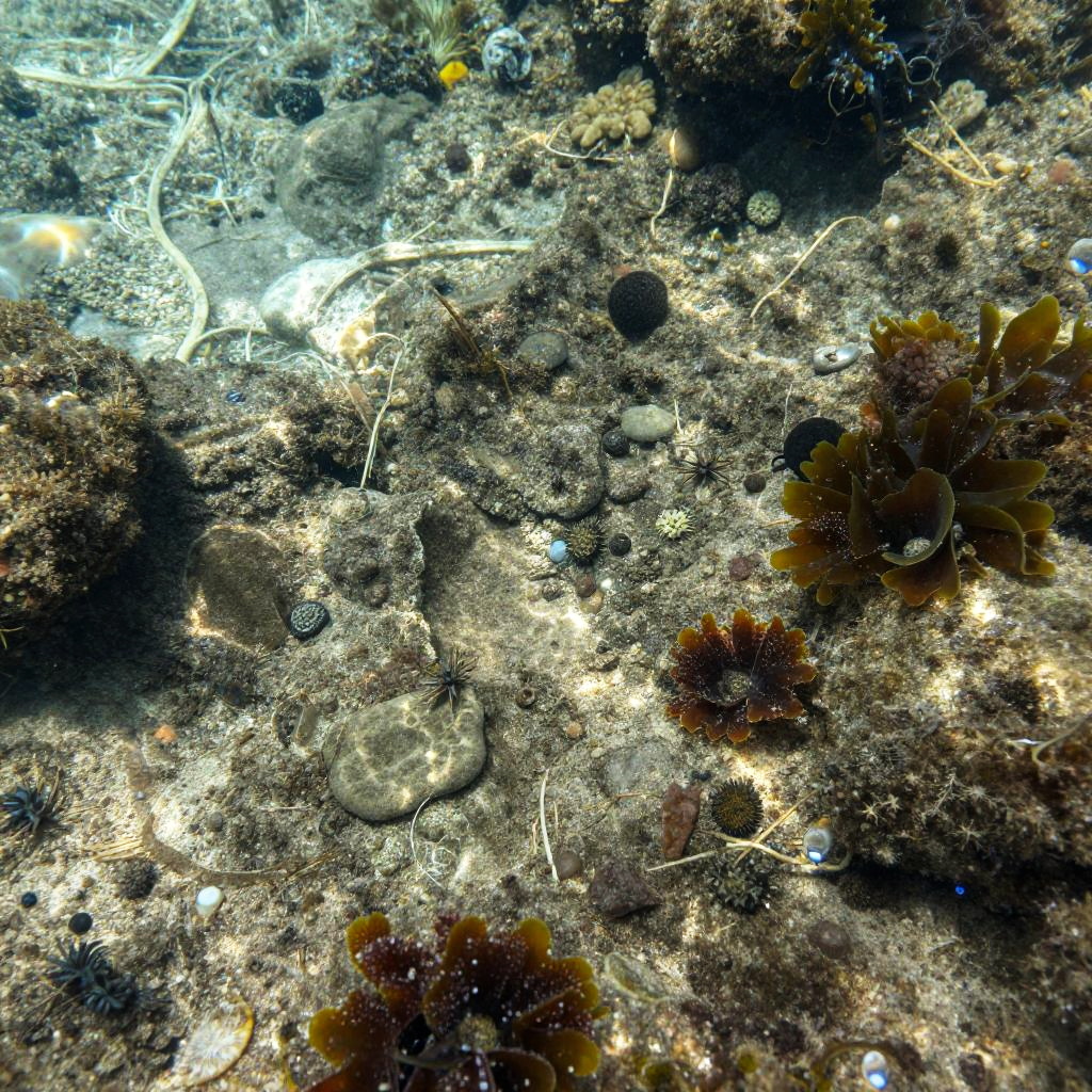 Close-up of ocean floor texture showcasing detailed rocky surfaces, smooth sand patches, clusters of colorful marine algae, and tiny sea creatures crawling, illuminated by soft underwater light