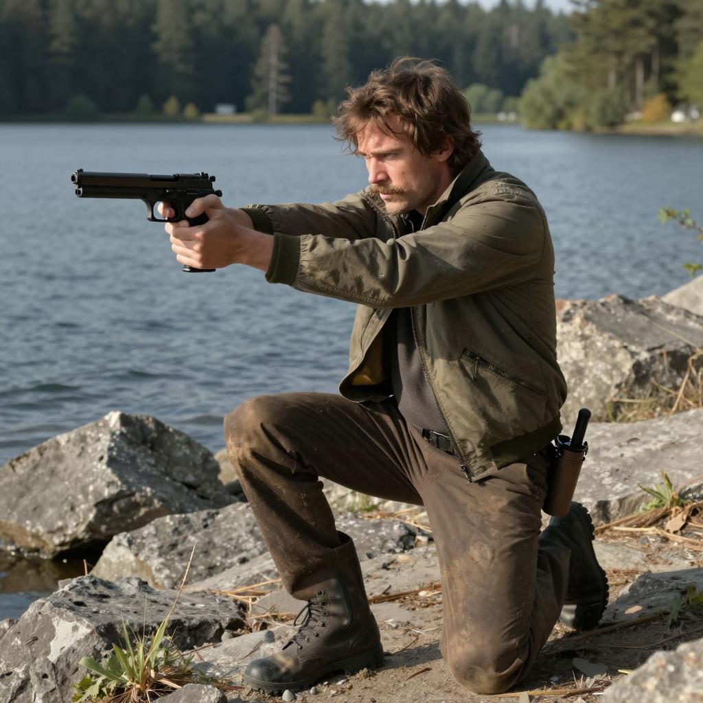 Man with brown hair and mustache, wearing dirty brown pants and jacket, crouches on rocky shore, aiming handgun forward. Background: calm lake, rocky shore, forested area. Sunlight casts shadows. Intense expression on his face. One knee on ground. Daytime.