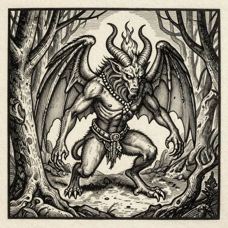 This is a black-and-white, highly detailed, woodcut-style illustration of a demonic creature. The creature has a muscular, humanoid body with fur-covered legs and claws, and large, bat-like wings. It has a snarling, beastly face with sharp teeth, horns, and pointed ears. It is adorned with a necklace of teeth and wears a loincloth with a belt. The background features twisted, dark trees framing the creature, creating a foreboding, forest-like setting. The texture is rich with cross-hatching, enhancing the dark, ominous atmosphere. The creature's stance is aggressive, with one clawed foot forward and wings spread wide.