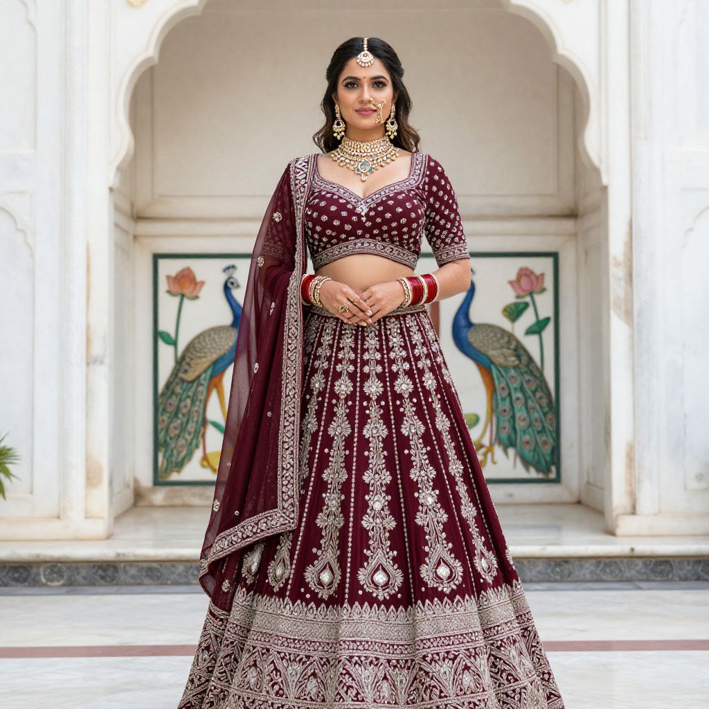 A regal lehenga choli woman in a traditional wedding ceremony setting, standing in front of a marble archway with peacock and lotus motifs, her face glowing with beauty and confidence, wearing a deep maroon lehenga with a silver-stitched choli, her jewelry highlighting her graceful posture and the rich cultural details of the attire in natural daylight.. The woman has big breasts and cute face