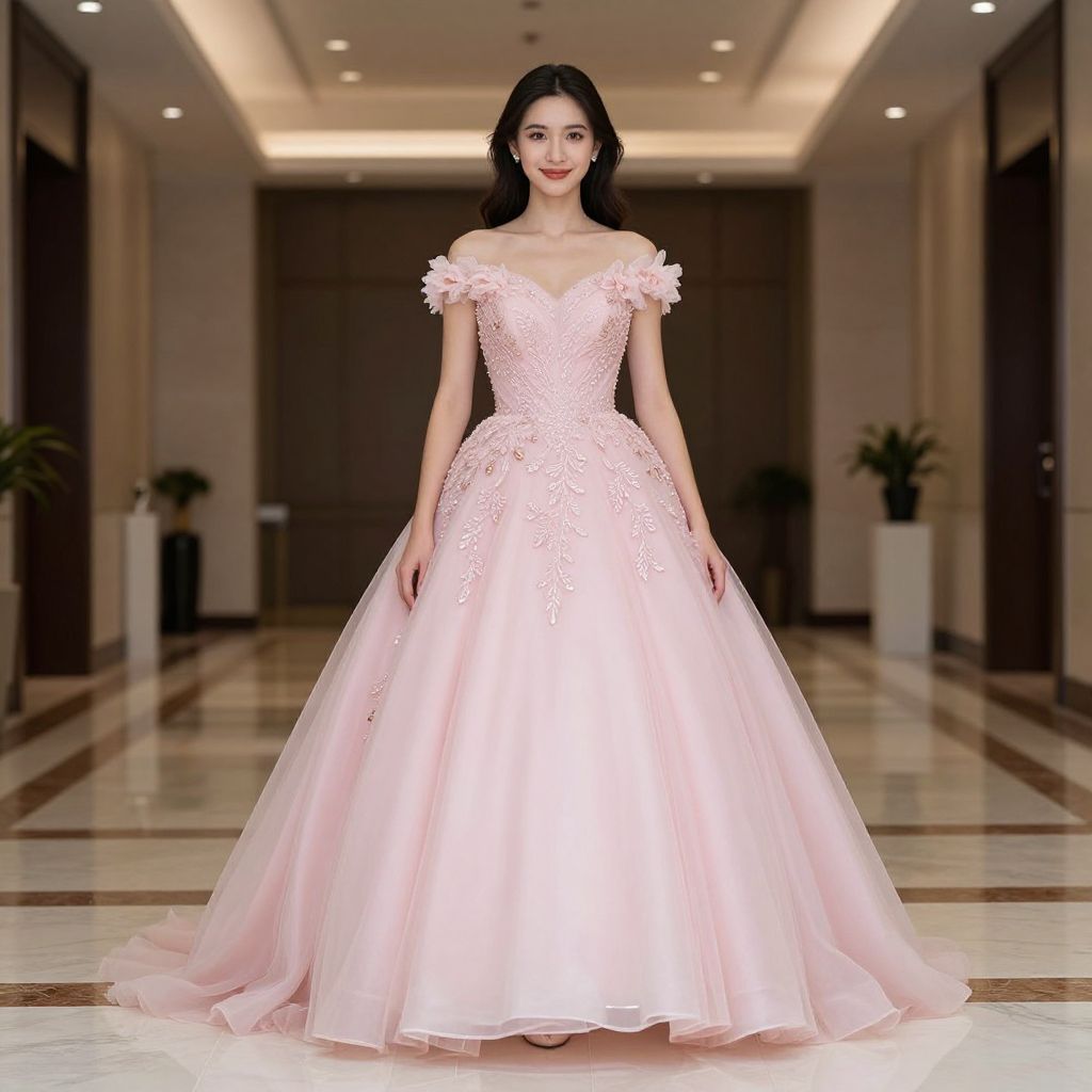 Pink Princess Ball Gown, a woman in a pink dress is standing in a hall