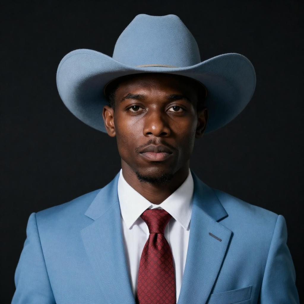 Photograph of a Black man with dark skin wearing a gray cowboy hat, blue suit, white shirt, and purple bowtie. He has a cigarette in his mouth and a headset with a microphone. Background shows blurred trees and structures. He looks serious, slightly down.