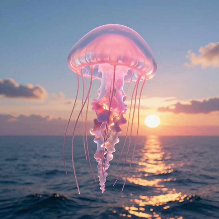 Photorealistic digital image of a glowing pink jellyfish floating over a calm ocean at sunset, with the sun reflecting on the water.