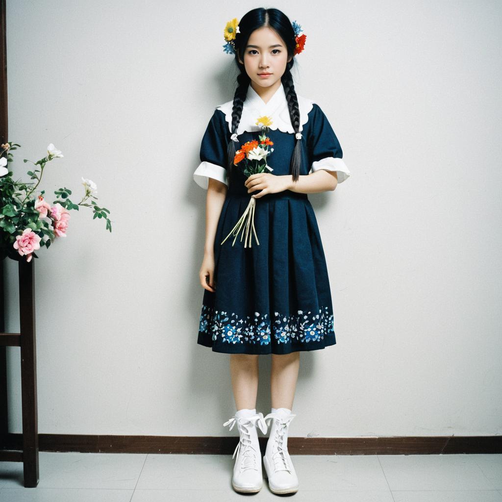 Femboy costume, 1girl, solo, brown hair, long hair, looking at viewer, fake animal ears, standing, belt, black footwear, brown eyes, full body, shoes, hood, black belt, k-pop, hat, blurry