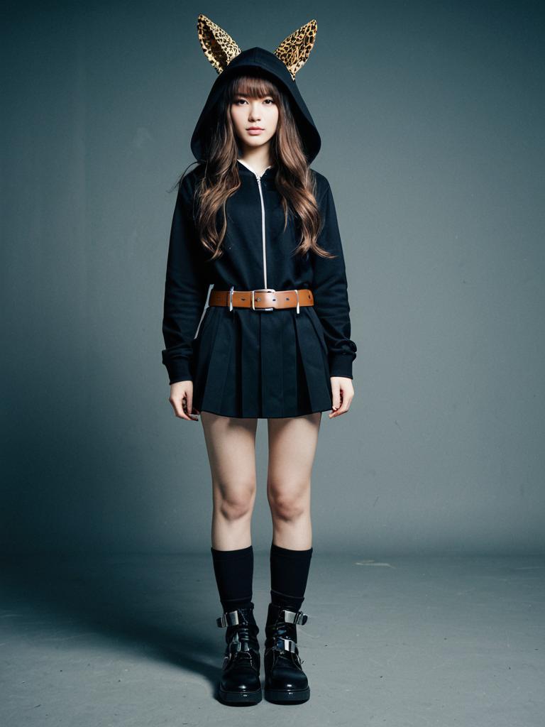 Full-body portrait of an Asian young woman with long brown hair and brown eyes wearing a black hooded jacket with leopard print animal ears, a pleated black skirt, black mid-calf socks, and black boots. She stands against a plain gray background looking directly at the camera with a neutral expression. The outfit features a wide brown belt and a stylish combination reflecting a modern, youthful fashion look.