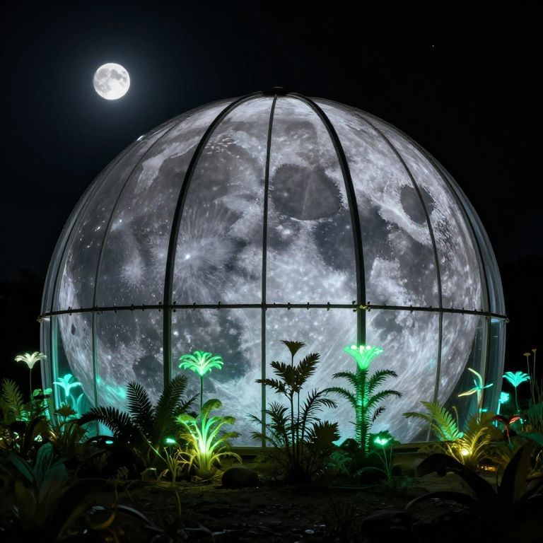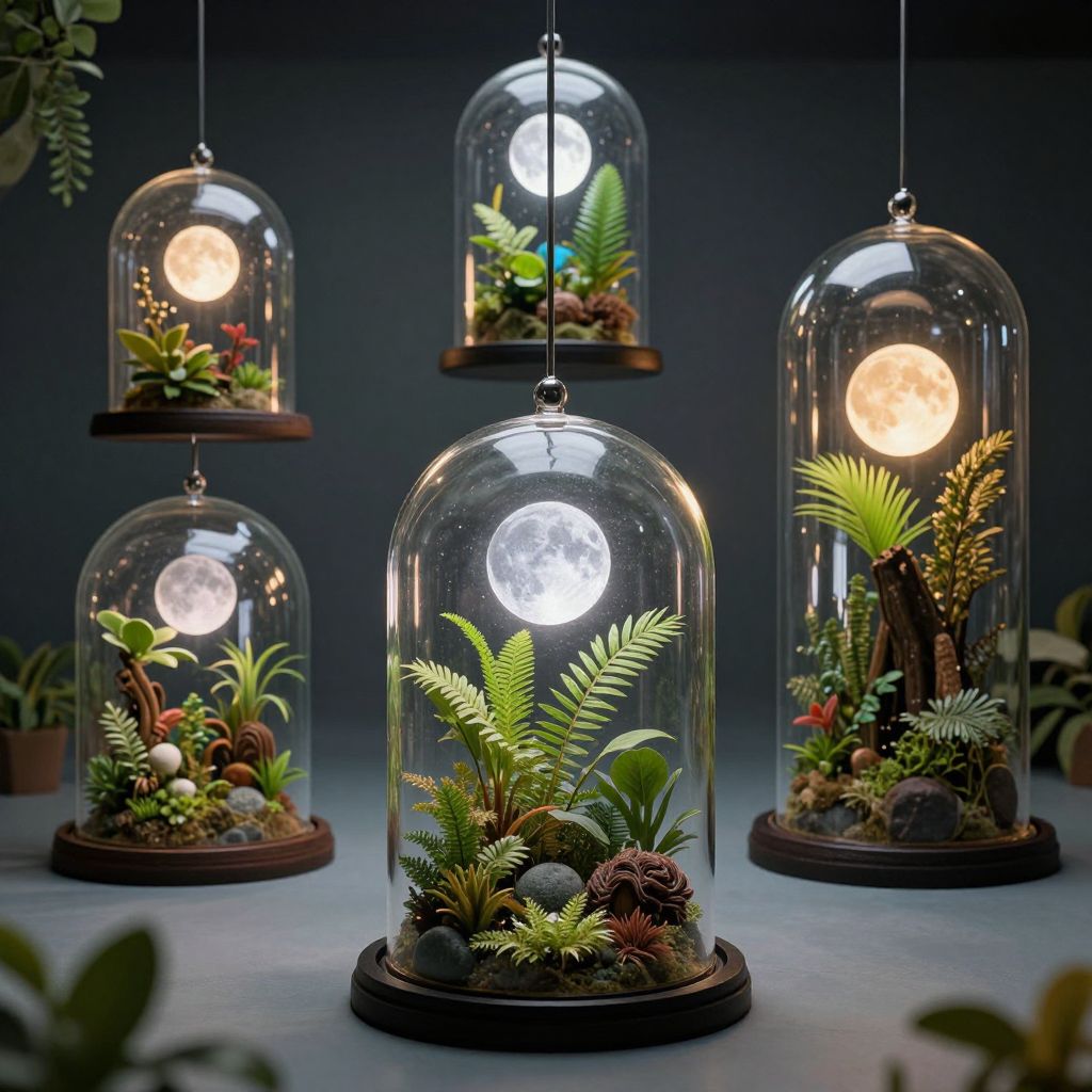 Suspended glass domes cradle miniature worlds of serenity, their artificial moons casting ethereal light upon verdant ecosystems, evoking a sense of timeless wonder and the delicate balance between human ingenuity and natural harmony.