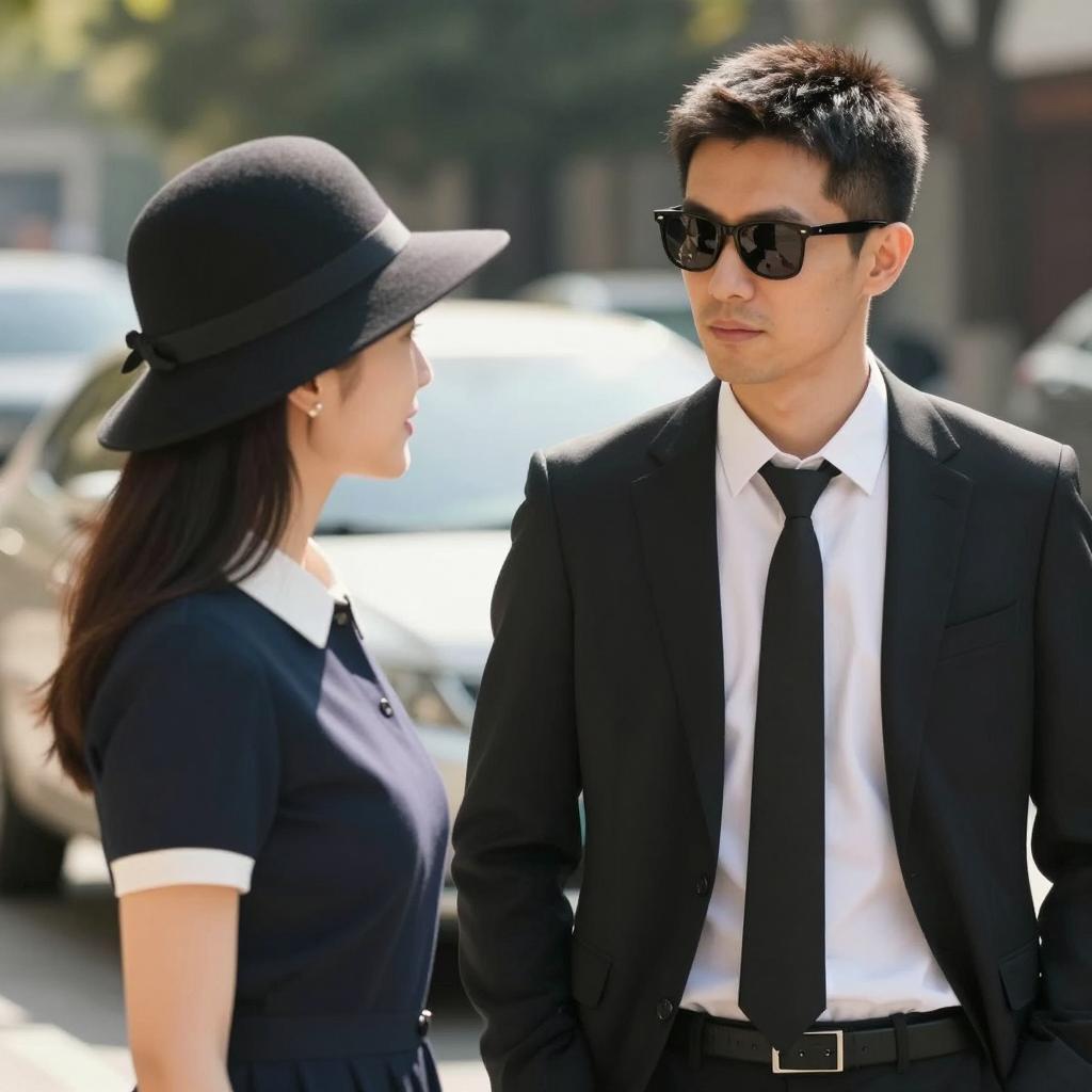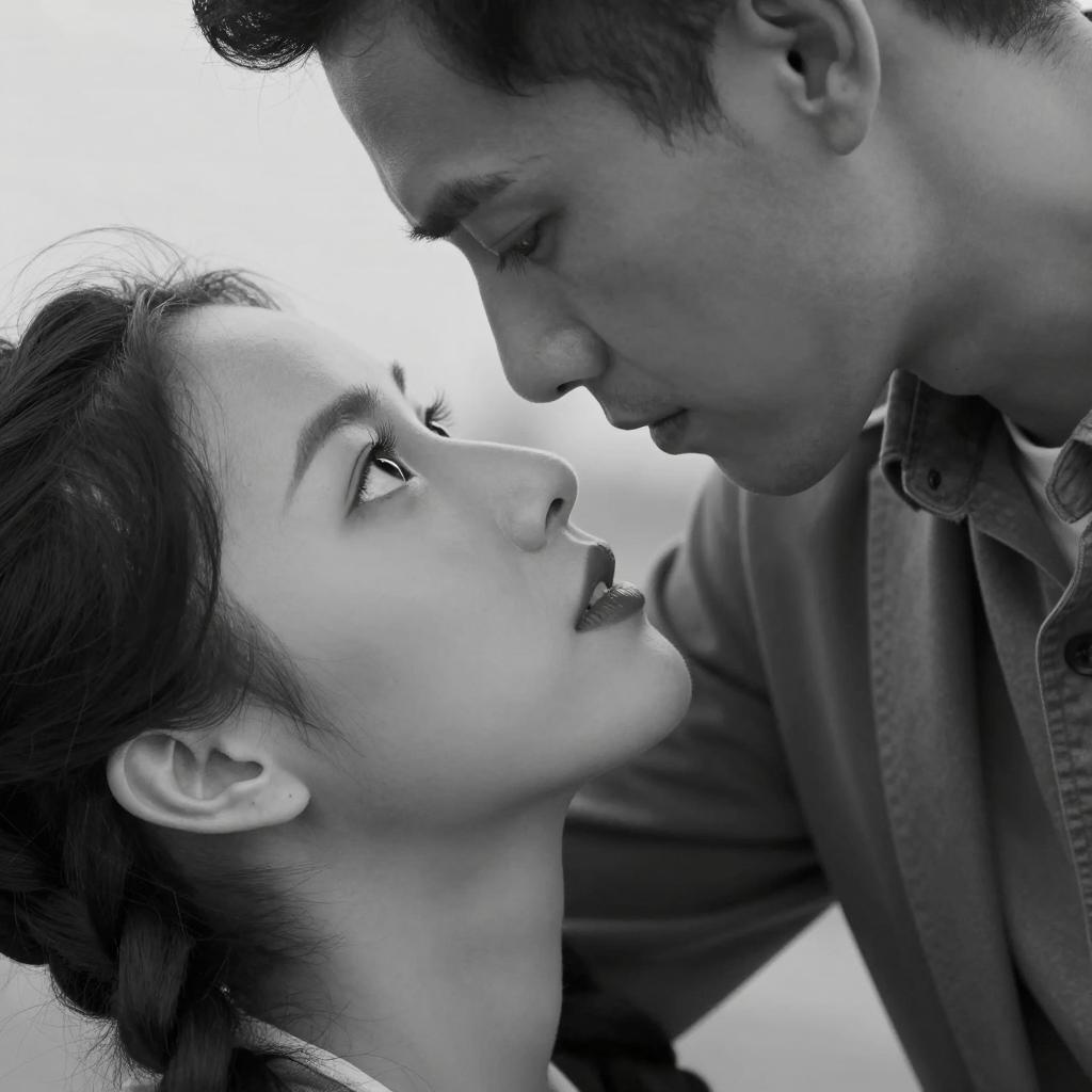A photograph of a man and woman standing close, both reaching up to touch a carved wooden column. The man, with dark short hair and a dark jacket, stands on the left. The woman, with short dark hair and a white sleeveless top, stands on the right. Bright light from a window behind them illuminates the scene. The woman's right arm is extended above her head, her left arm supporting the column. The man's face is partially shadowed.