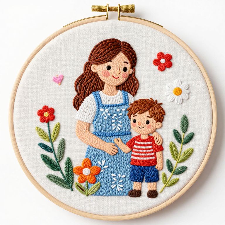 Embroidery Sampler a illustration that represents mothers day, mother and sons ,pixat animation studios style ,white background,