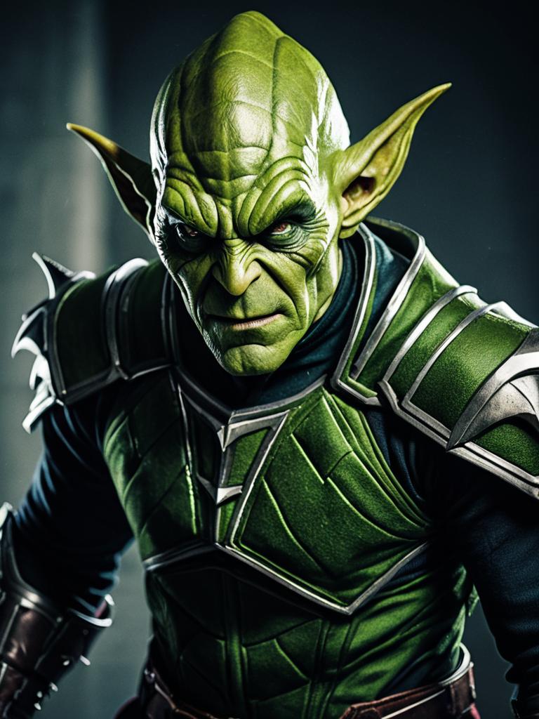 Close-up portrait of a man wearing a detailed Green Goblin cosplay costume. The costume features a green goblin mask with pronounced wrinkles, pointed ears, and a menacing expression. The outfit includes a green armored vest with silver accents and dark shoulder armor. The scene is dramatic with moody lighting and a dark, smoky background.