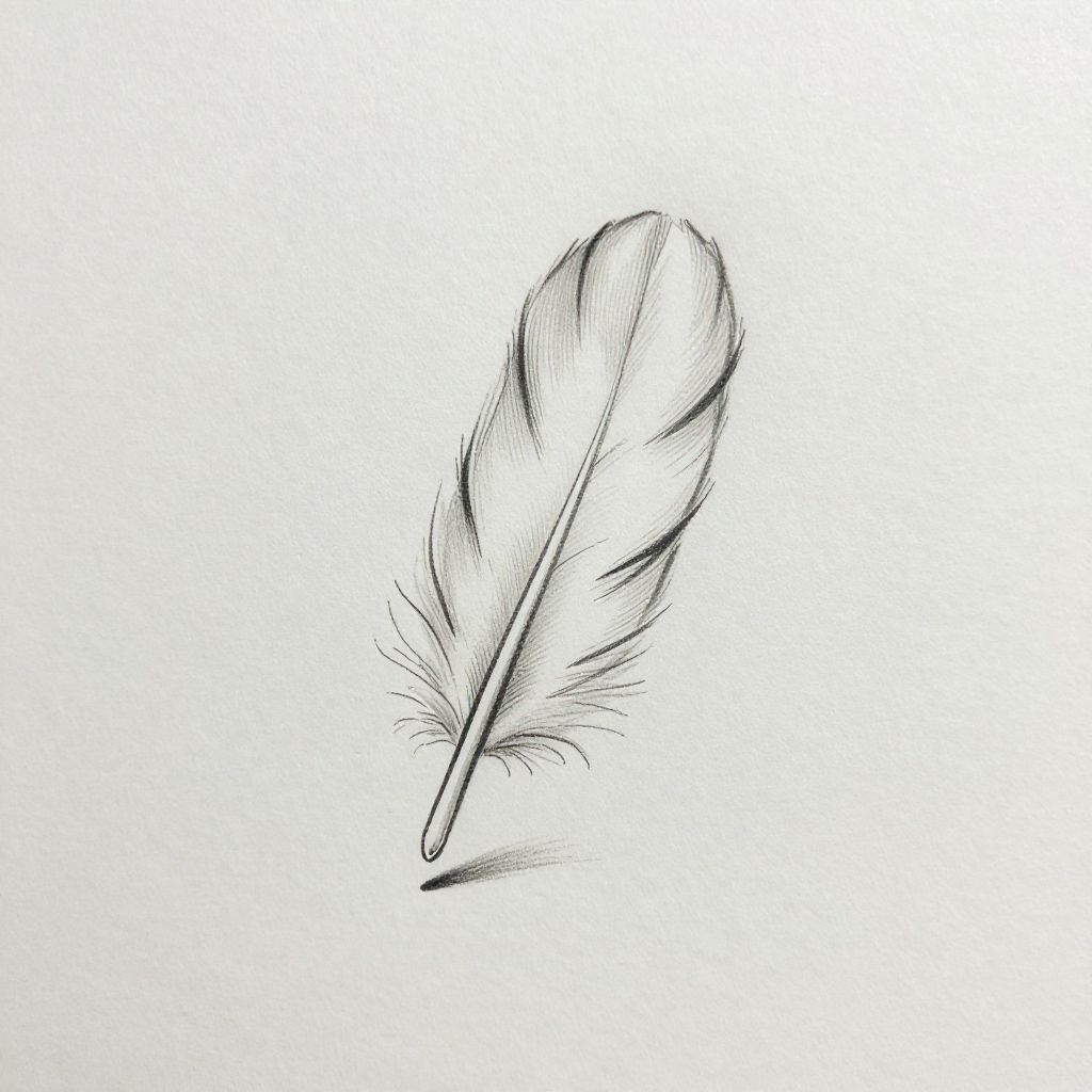 Art sketch easy design portraying a single elegant feather floating down, with fine line details and minimal shading to highlight its gentle curves and lightness, set against a plain background to enhance simplicity.