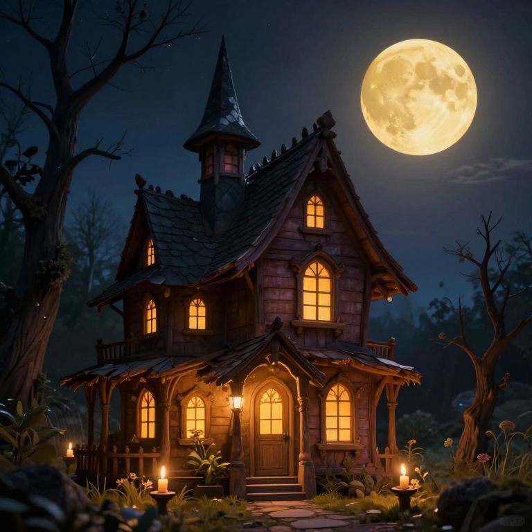 Under the watchful glow of a golden moon, a whimsical witch’s house radiates warmth and wonder, inviting the soul into a sanctuary of enchantment where dreams take root and secrets whisper softly amidst the flickering candlelight.