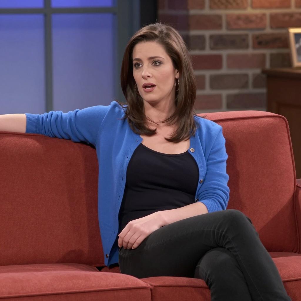 Woman with light skin, brown hair, wearing blue cardigan and black top, sitting on red upholstered couch, legs spread, right arm extended, left arm resting on couch, mouth open in mid-sentence. Brick wall and window in background. Casual setting.