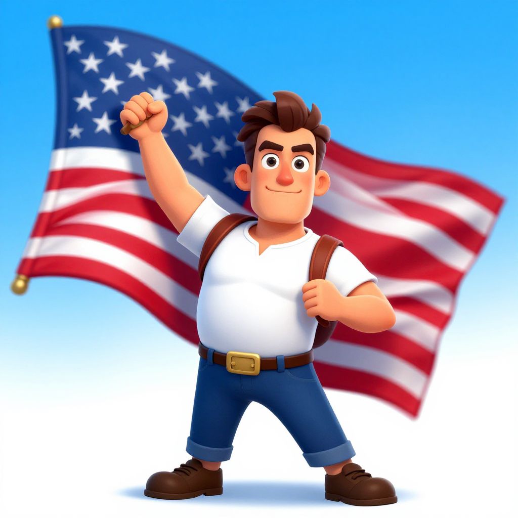 Cartoon man with brown hair, white shirt, blue pants, brown belt, and brown shoes, raises fist in front of waving American flag. Blue