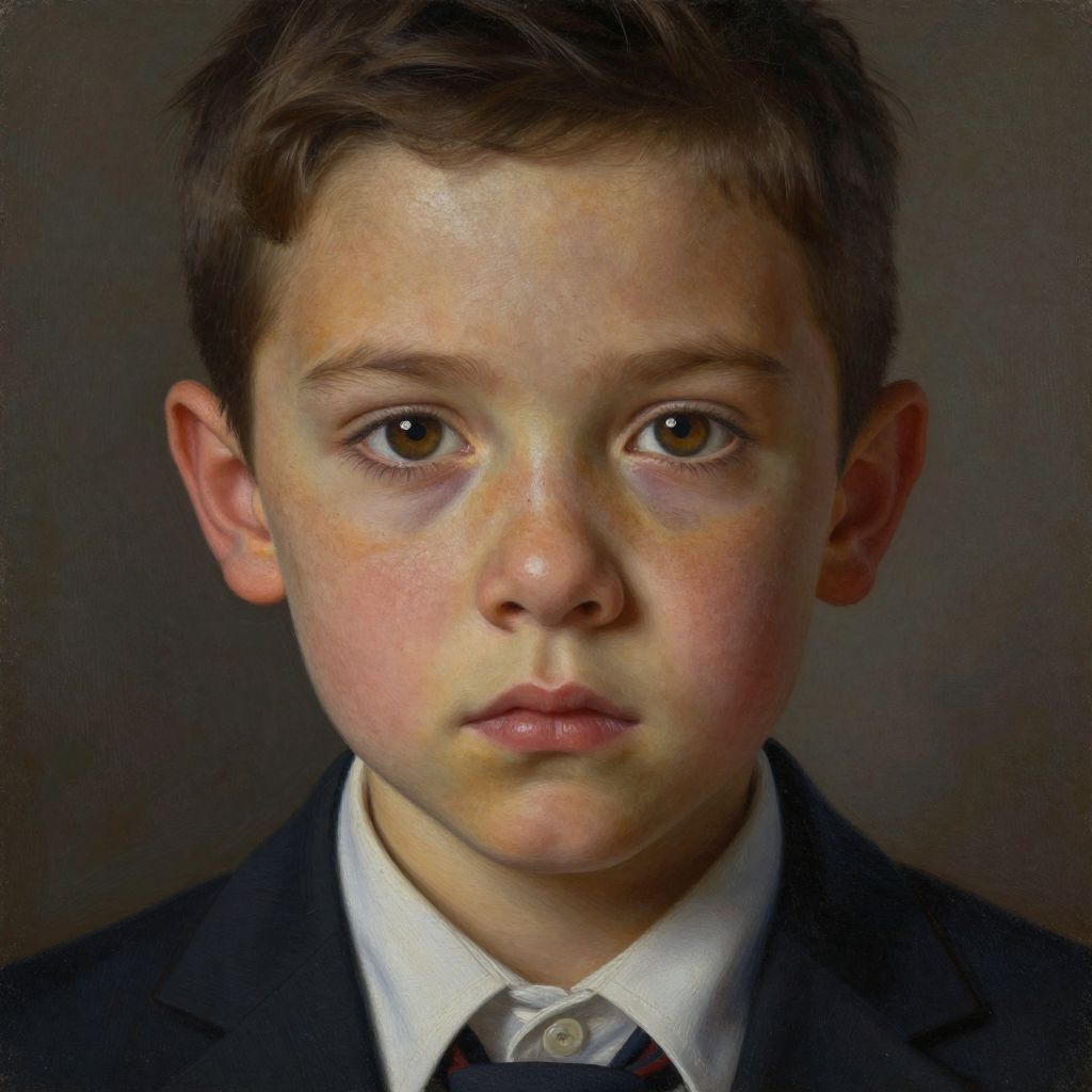 Portrait of a 7 year old child, gritty, serious, wearing a suit, very detailed eyes, hyperrealistic, beautiful, very detailed painting by glenn fabry, by joao ruas, by artgerm
