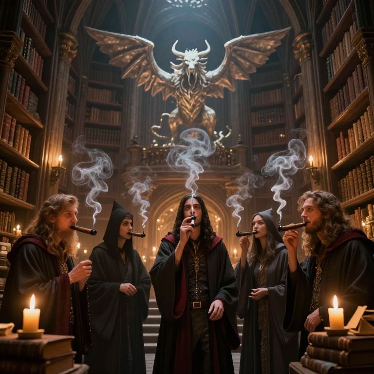 Group of wizards smoking enchanted cigars, smoke swirling into shapes of mythical creatures, inside a towering ancient library filled with spell books and glowing candles, warm lighting and rich detailed backgrounds, fantasy concept art.
