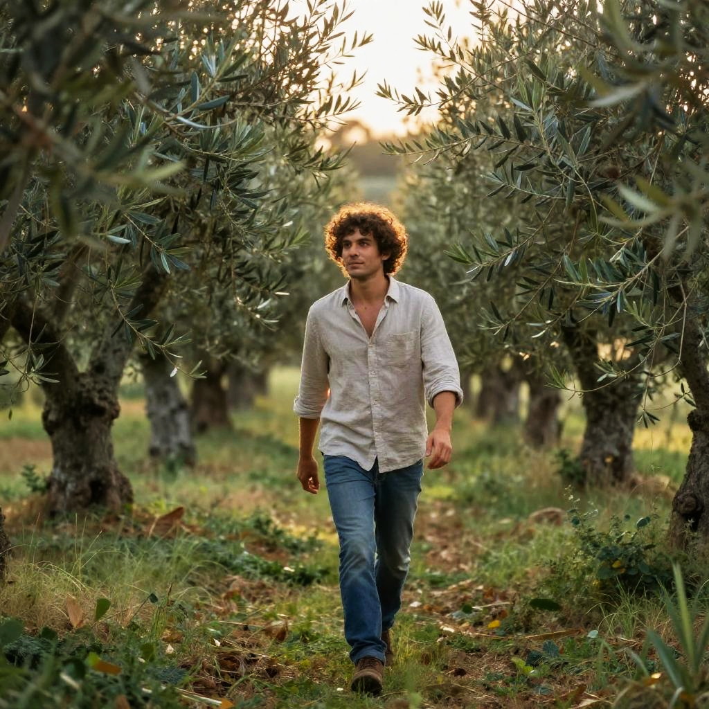 Italian man curly hair, walking through a lush olive grove in Tuscany, casual linen shirt and jeans, sun rays breaking through the leaves, serene and natural setting