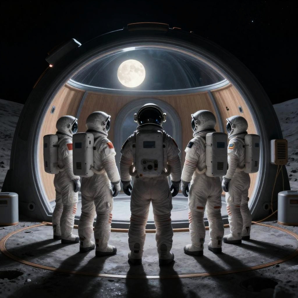 Space-themed interior with a person in a red spacesuit and helmet walking left, another person in a brown suit facing away, and a robotic figure with a helmet on the right. Background includes two large, circular machines with multiple buttons and panels. Overhead lights illuminate the scene.