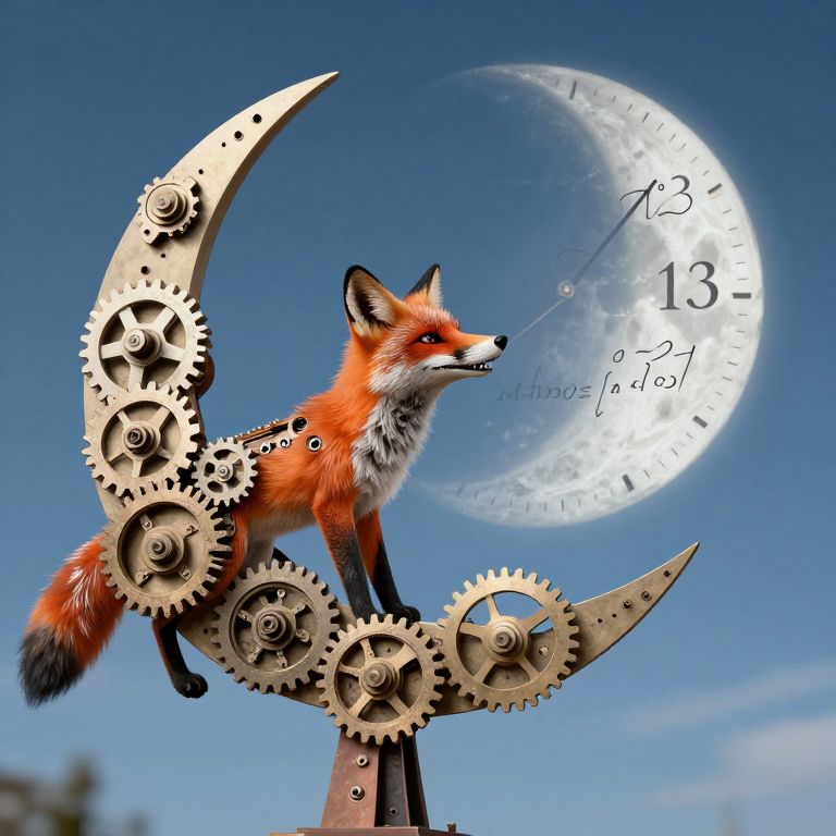 A clockwork fox with gears for fur barks equations at a moon-shaped sundial that casts time into the sky.