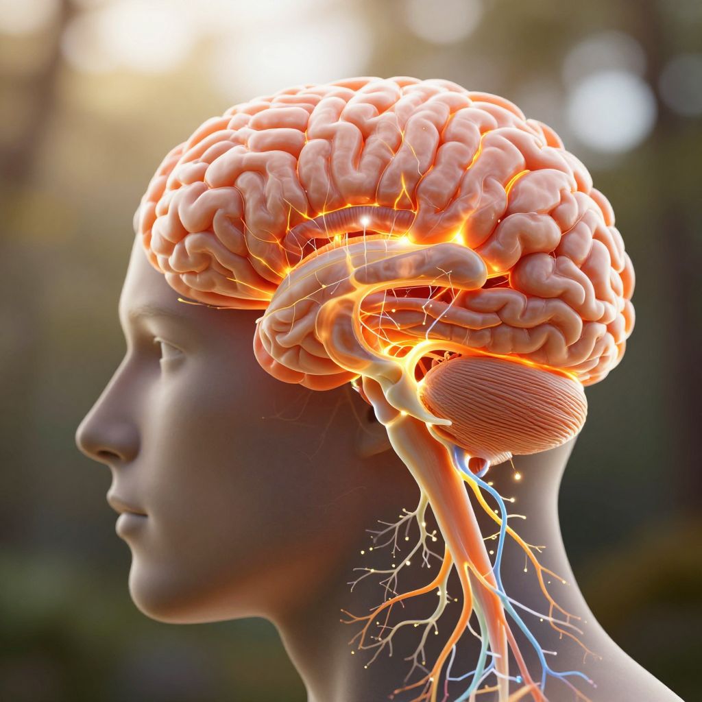 The image presents a highly detailed, ultrarealistic depiction of a human head, with a striking focus on the brain. The brain is illuminated with vibrant, dynamic neurons, dopamine circuits, and electrical charges, creating a mesmerizing visual effect. The lighting is natural, with sunlight filtering through, casting a warm, golden glow that enhances the intricate details of the brain's structure. The background is a soft, blurred natural setting, with a wide-angle perspective that emphasizes the depth and complexity of the scene. The overall composition is balanced, with the brain positioned centrally, drawing the viewer's attention to the intricate patterns and textures of the neural activity. The image is rich in color, with shades of orange, yellow, and white dominating the palette, creating a sense of warmth and vitality. The textures are highly detailed, from the smooth, glossy surface of the brain to the delicate, branching patterns of the neurons. The image is a stunning representation of the human brain, capturing both its complexity and beauty in an awe-inspiring manner.
