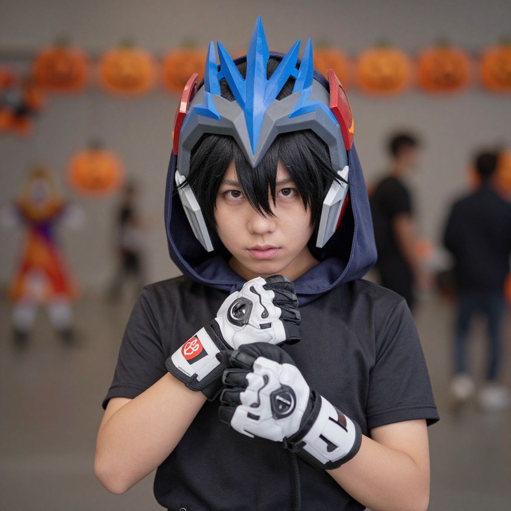 Beyblade halloween costume, solo, male focus, 1boy, looking at viewer, gloves, helmet, blurry background, hood, standing, black hair