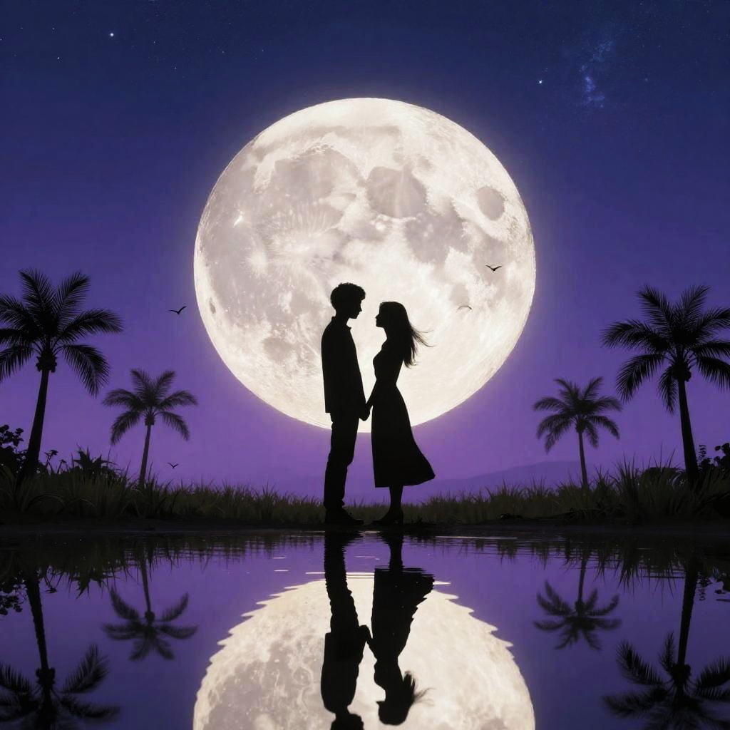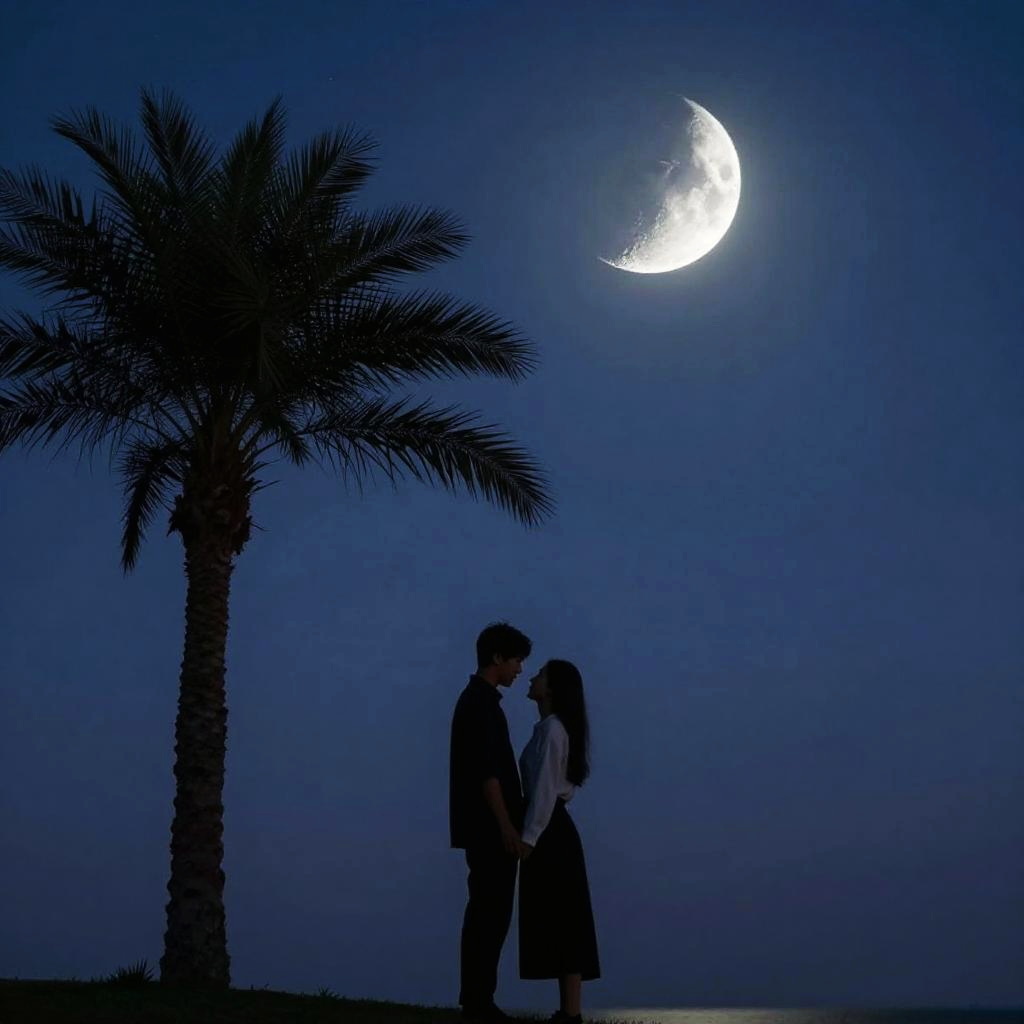Silhouetted image of a couple standing close together under a bright, crescent moon and starry night sky. A tall palm tree is on the left, its fronds softly illuminated by the moonlight. The background is a deep blue gradient, with the couple's outlines creating a romantic, mysterious vibe. The scene feels peaceful and intimate, with the couple's figures barely visible against the dark, night sky.