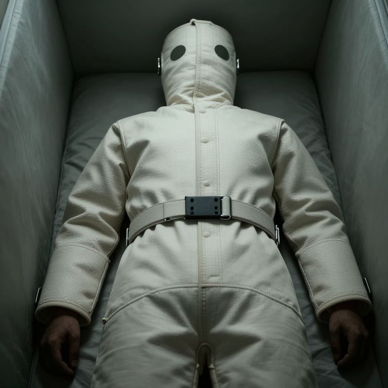 Photograph of a person in a white, full-body restraint suit with a black mask, lying inside a narrow, dimly-lit, metallic box