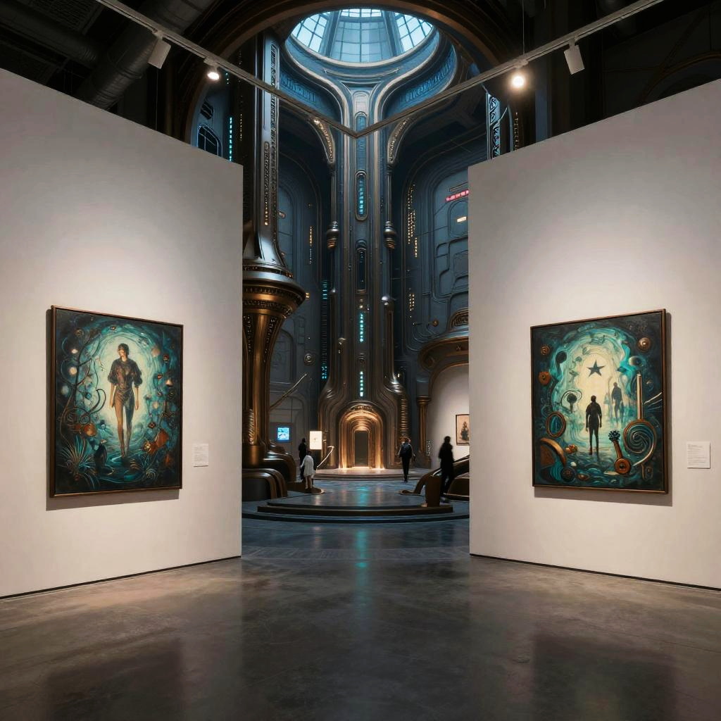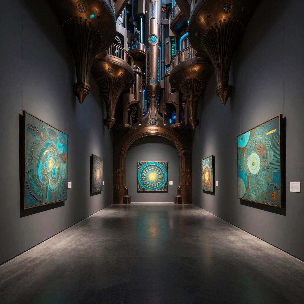 A stunning art gallery interior, featuring the best of cyberpunk dystopian art, in the style of Maciej Kuciara, Yuumei, with dark bronze and cyan hues, intricate architectures inspired by Frank Lloyd Wright, dark gray and aquamarine color scheme