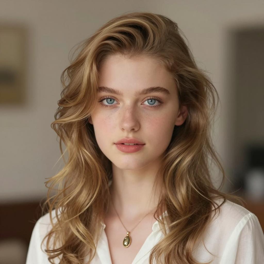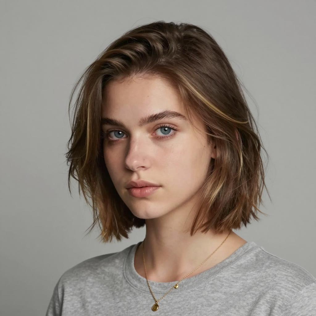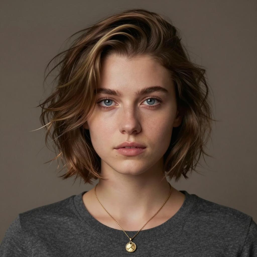 Male cut curly hairstyle, photorealistic, portrait of a young woman with short, wavy brown hair, side undercut, fair skin, blue eyes, red lipstick, wearing a beige high-collared shirt, gold necklace with small pendant, soft light, blurred background with framed picture, elegant and confident expression, digital art, T2I, realistic ures, high detail, studio lighting, fashionable, modern, feminine, stylish, subtle makeup