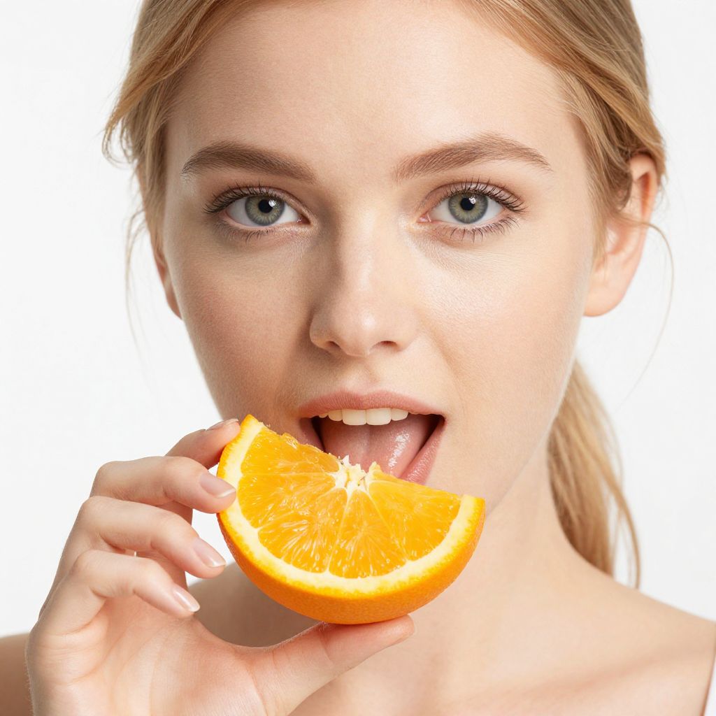 Photograph of a young Caucasian woman with light blonde hair and blue eyes, smiling while biting into a bright orange slice. She has fair skin, light makeup, and wears a white top. Her right hand is holding the orange slice close to her mouth. The background is plain white, making her and the orange slice the focal points. The image has a high-contrast, clean, and sharp style, emphasizing the freshness of the orange and the woman's cheerful expression.