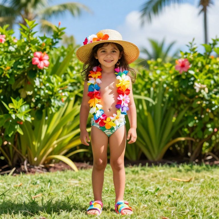 A young girl with bright, curious eyes and sun-kissed skin stands in a sunny tropical garden, wearing a vibrant straw hat adorned with colorful flowers, a delicate lei made of fresh tropical blossoms around her neck, and comfortable, colorful sandals. She is smiling warmly, her bare feet resting on soft grass, with a gentle breeze rustling the leaves around her. The background features lush green plants, blooming hibiscus, and a clear blue sky with soft clouds, creating a joyful and carefree atmosphere.