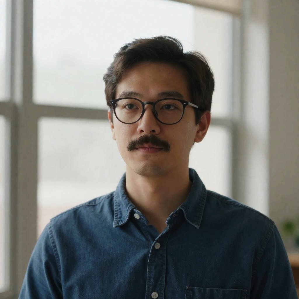 Photograph of a man with long blonde hair, wearing glasses, and a plaid shirt. He is smiling softly. Background has a blurred, yellow and blue sign. Wooden wall behind him. Upper body shot. Light, casual style. One person.