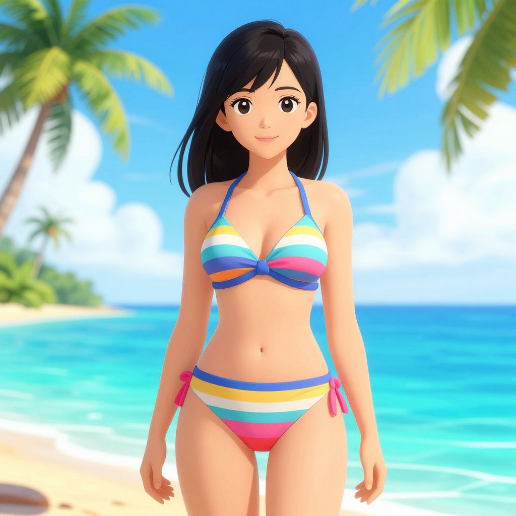 Small boobs beach portrait, a young woman in a colorful swimsuit standing by turquoise water, bright sunny sky, tropical palm trees, vibrant summer vibe, detailed illustration
