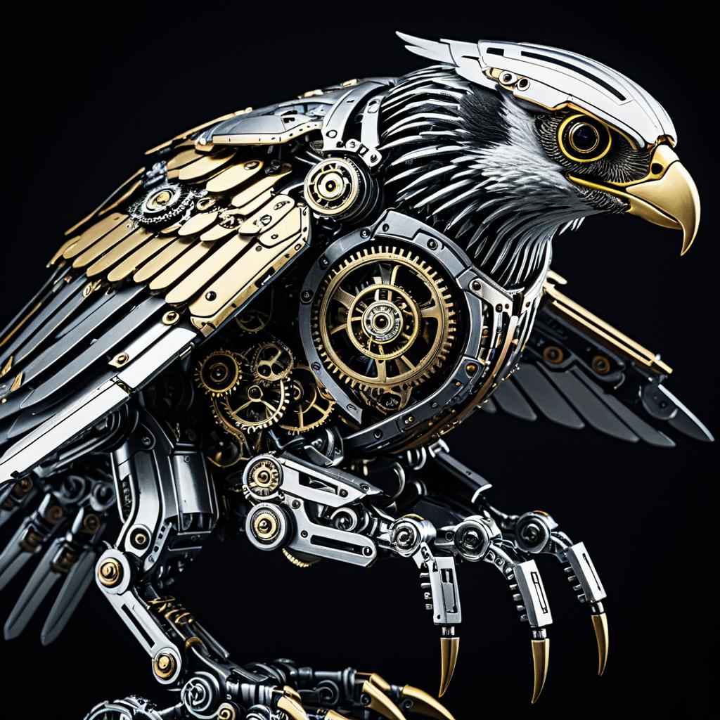 Robotic falcon with articulated talons, intricate details, gears and springs, polished titanium textures, complex layering, cyberpunk vibe, high contrast lighting, shadows enhancing depth, cold metallic tones with brass accents, ultra-detailed, imaginative design, futuristic technology, vivid representation, sharp focus on intricacies, dynamic composition, engaging atmosphere.