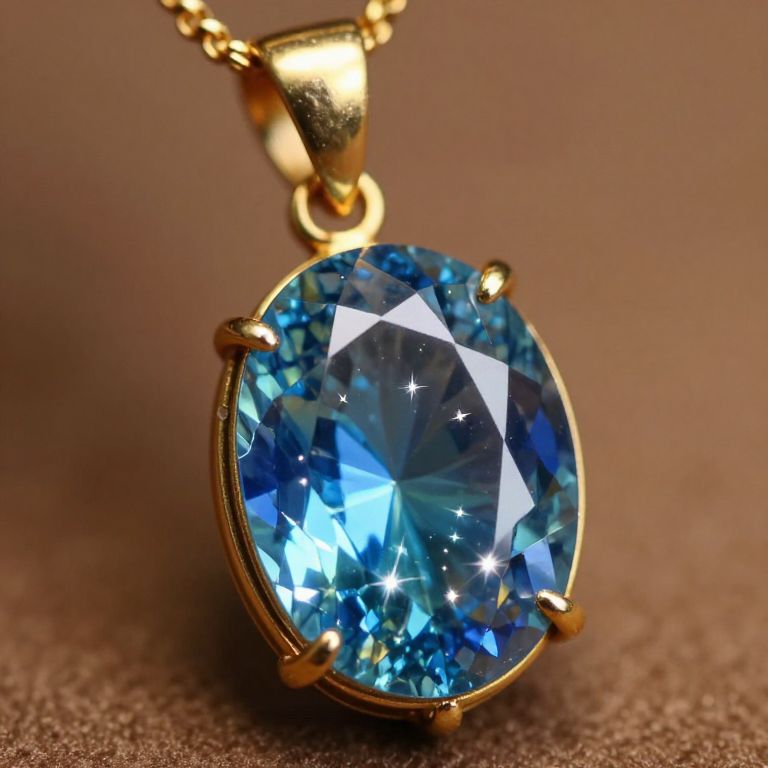 This photograph showcases a close-up of a round, brilliant-cut blue gemstone pendant set in a gold prong setting. The gemstone, with its rich, vibrant blue hues, reflects light and sparkles with star-like reflections. The gold setting is simple yet elegant, with four prongs securely holding the gemstone in place. The pendant is attached to a gold chain, visible at the top of the image. The background is a blurred, textured brown surface, which contrasts with the bright, shimmering blue of the gemstone. The image emphasizes the gemstone's clarity and brilliance, highlighting its exquisite craftsmanship and beauty.