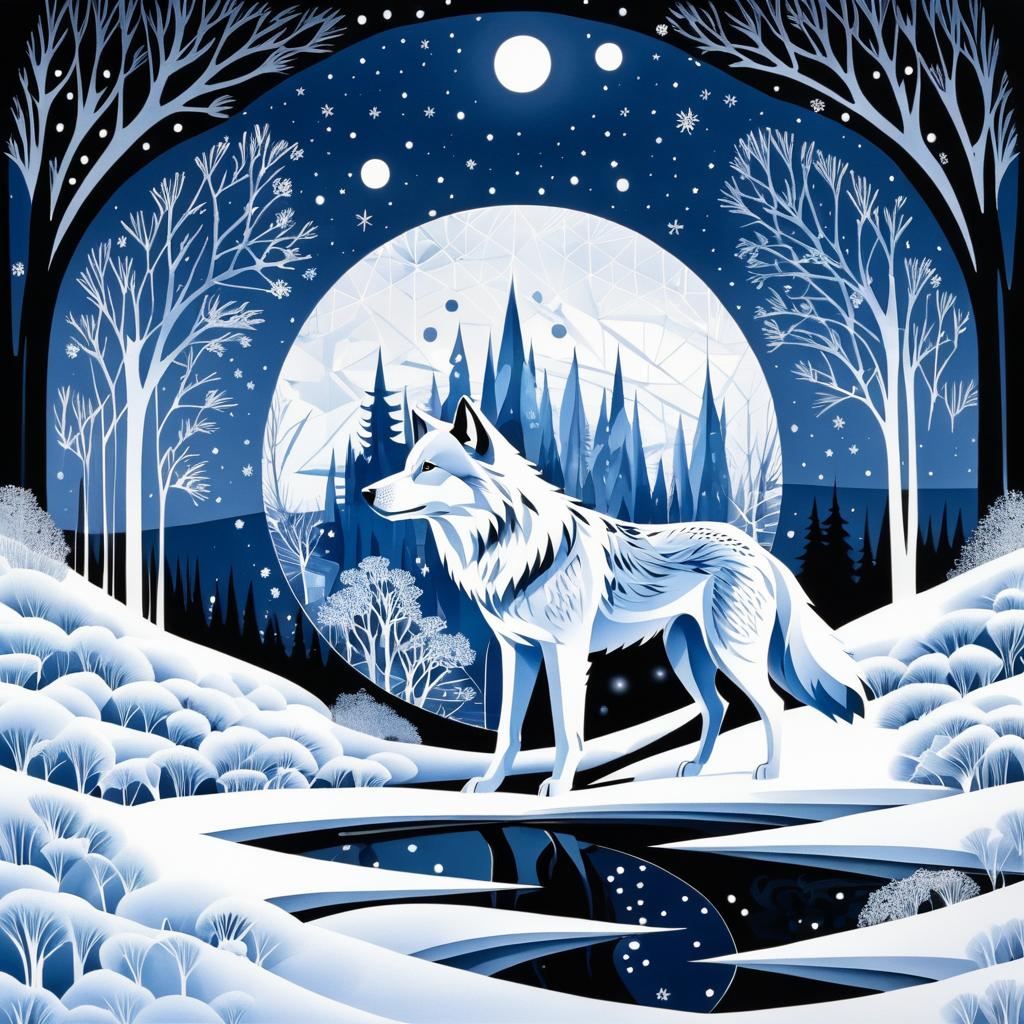 A wolf in a magical, detailed ink illustration with a snow-covered landscape, icy white, dark atmosphere by Charley Harper, Robert Gonsalves.