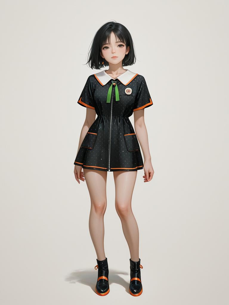 1girl, realistic face, full body shot, Woman, retro mod, A-line mini dress in cream with small black polka dots, pointed collar, short sleeves with orange trim, front pocket with green tag, zipper closure at the back, thigh-length, white background.