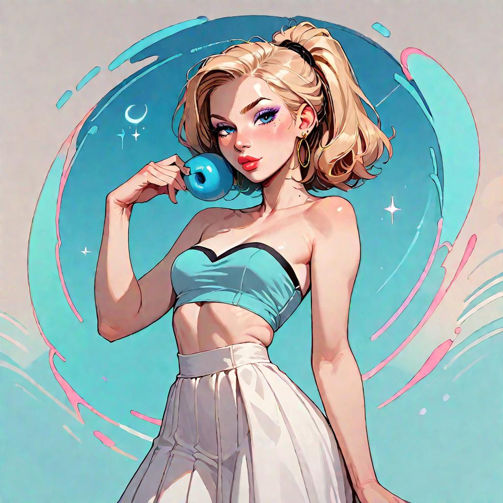 Score_9, score_8_up, score_7_up, score_6_up, flat color, makeup, solo, standing, bedroom eyes, looking at viewer, blonde hair, ponytail, skirt, mouth open, small breasts, strapless, sleeveless