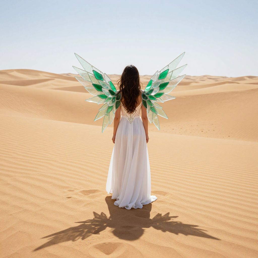 A woman stands in a vast desert, her back turned to the viewer, adorned with translucent green glass shards that form ethereal wings, casting intricate shadows on the golden sand beneath her flowing white gown.