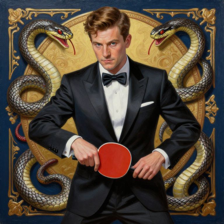 Polyester troy brooks style painting, subject is a fancy, well dressed professional ping pong player surrounded by snakes, ornate, 4k,