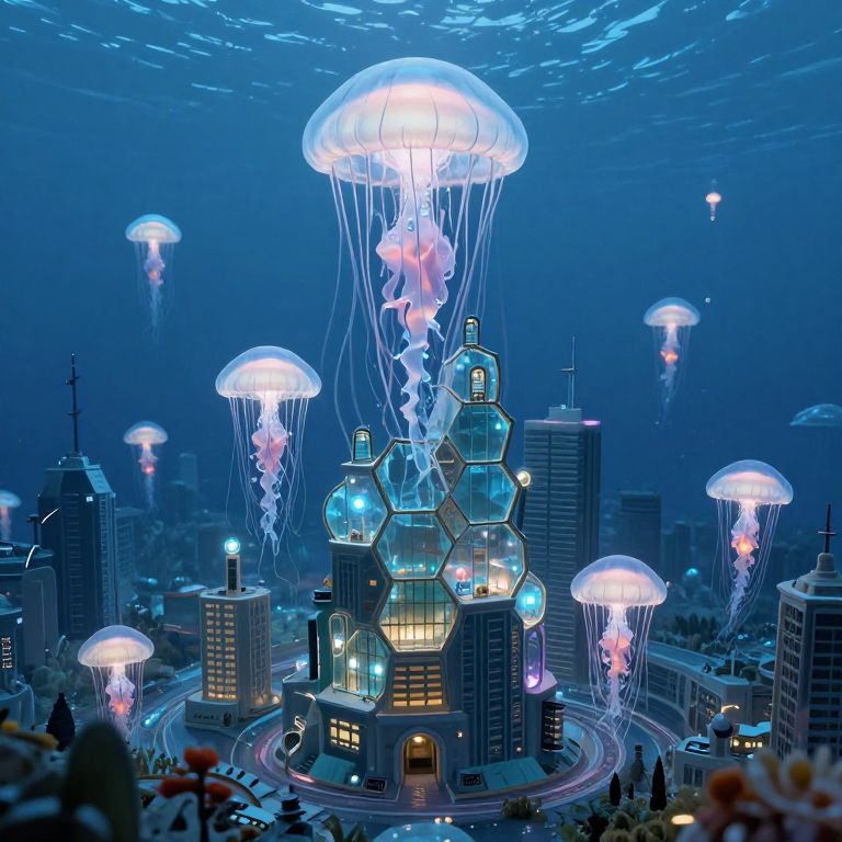 Cities of honeycomb glass rise from the ocean’s floor, inhabited by jellyfish architects who design structures through synchronized light pulses.