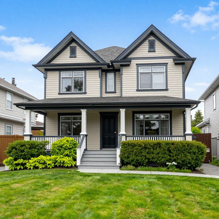 Stately two-story home at 2966 West 45th Avenue, Vancouver, showcasing a classic design with light beige siding, dark gray trim, and a welcoming front porch featuring white columns, a black door, and a staircase leading to a manicured lawn bordered by vibrant green shrubs and neatly trimmed hedges.
