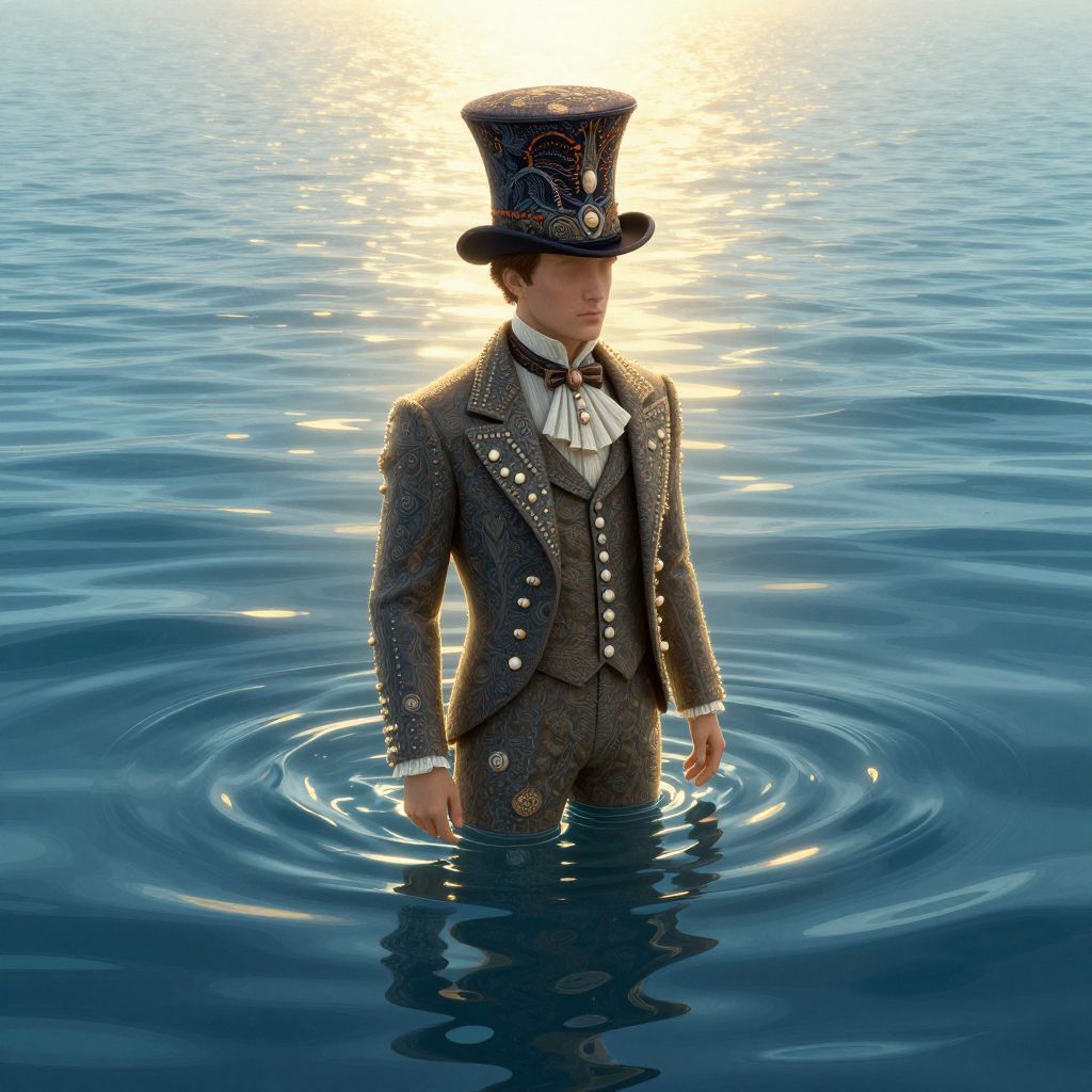 Craft an image in the surrealist vein, depicting a solitary figure standing amidst an expansive ocean with waves crashing fervently around them. The subject appears to be submerged underwater yet remains unsoaked, dressed in a meticulously tailored suit and a bowler hat reminiscent of early 20th-century fashion. This striking contrast between the figure's serene countenance and the chaotic sea envelops the scene in an aura of mystery and fascination, stirring emotions that fluctuate from intrigue to awe within an evocative spectrum.