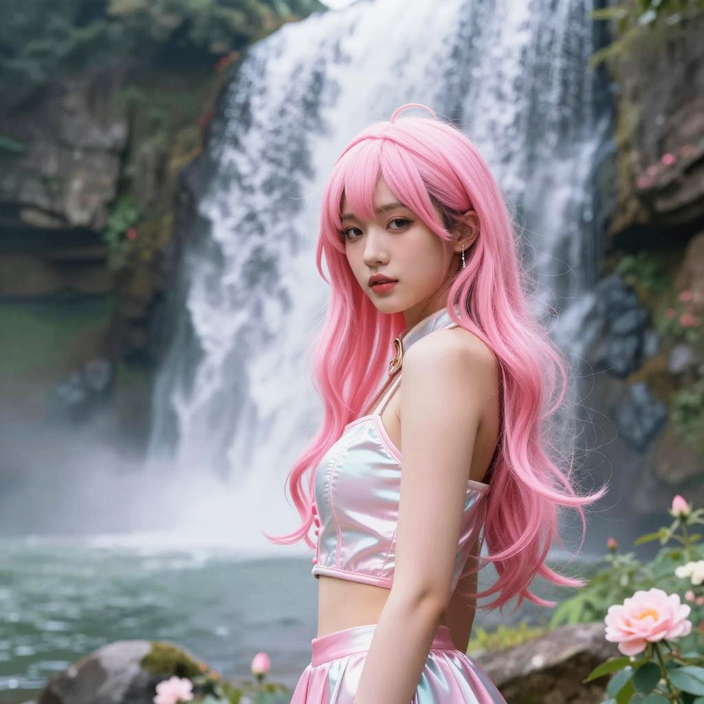 A striking illustration featuring a woman with vibrant pink hair, set against a picturesque waterfall. She is dressed in a sleek, shiny outfit, blending harmoniously with the surrounding floral landscape. The artwork captures a sense of fantasy and beauty, emphasizing the character's captivating presence amidst nature.