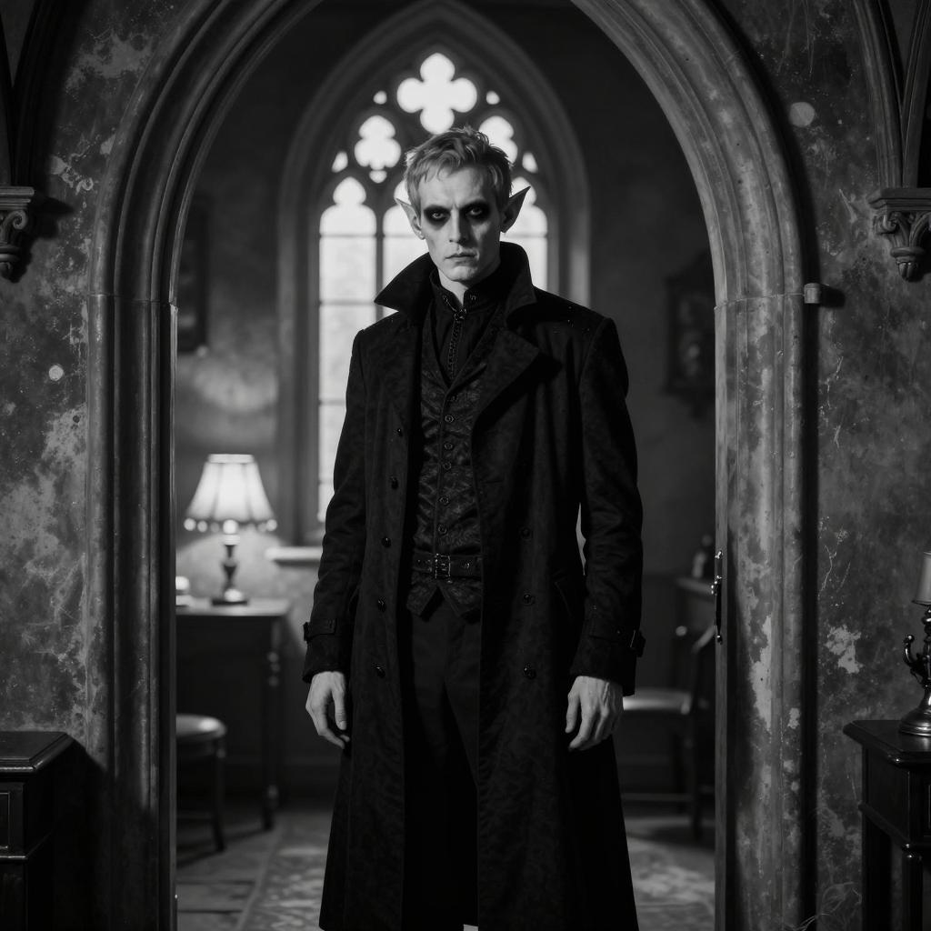 Black and white photograph of a man with pale skin and pointed ears, standing in a gothic-style arched doorway. He wears a dark, long coat with hands slightly apart. Background includes a window with light patterns and a small table with a lamp. The scene is dimly lit, emphasizing the eerie, mysterious atmosphere.