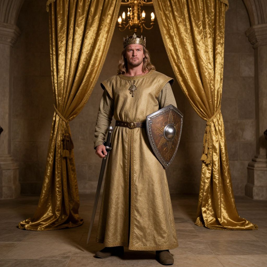 A man in a medieval costume with a crown on his head, standing in front of a gold curtain. He has a strong, rugged appearance with a muscular build and a determined expression. His medieval attire includes a long, flowing robe, a shield, and a sword at his side. The scene is set in a grand, ancient hall with stone walls and a grand chandelier hanging from the ceiling. The gold curtain adds a regal touch to the overall atmosphere, emphasizing his noble status. The lighting is soft and dramatic, casting long shadows and highlighting his regal presence.